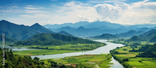 Aerial drone shot of a picturesque river in the lush green tropical forest of Southeast Asia with mountains in the backdrop, perfect for copy space image.