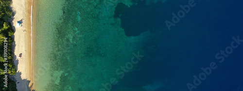 Aerial drone ultra wide panoramic photo of tropical exotic emerald sea wit turquoise crystal clear waters in asian destination island
