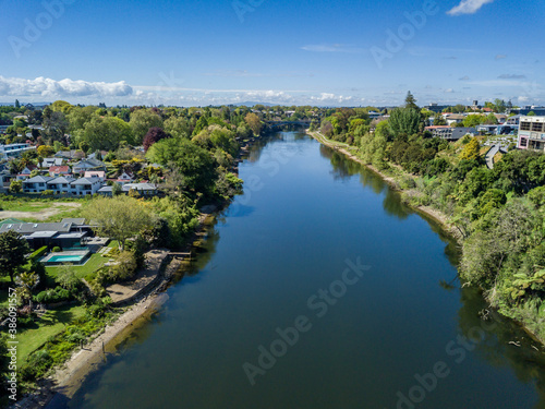 Aerial drone view looking at Victoria Bridge over the Waikato River as it cuts through the city of Hamilton, in the Waikato region of New Zealand