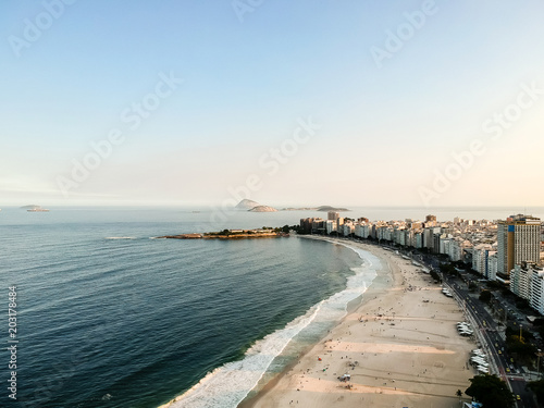 aerial drone view of Copacabana beachs during late afternoon,, some shadows can be seen on the sand. Rio de Janeiro, Brazil