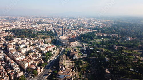 Aerial drone view of iconic and beautiful ancient Arena of Colosseum, also known as the Flavian amphitheatre in the heart of Roman Forum, rome, Italy