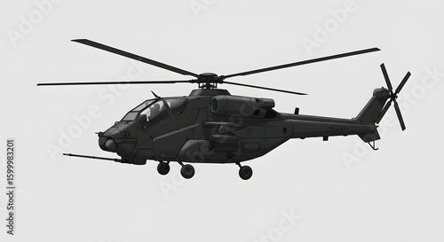 Aerial Military Machine Discover a sleek, high-tech helicopter in monochrome soaring through the skies, a symbol of strength and cutting-edge aviation tech.