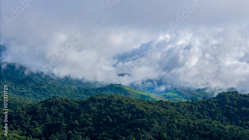 Aerial of Village in rain cloud cover tropical green mountain. Rainy season. Misty cover green forest. beautiful green village