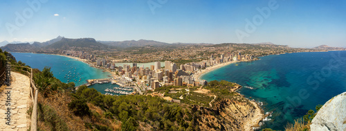 Aerial panorama of the Costa Blanca. Panoramic view of Calpe from famous rock - Penon de Ifach, overlooking the coast, the harbor, lake and the city..