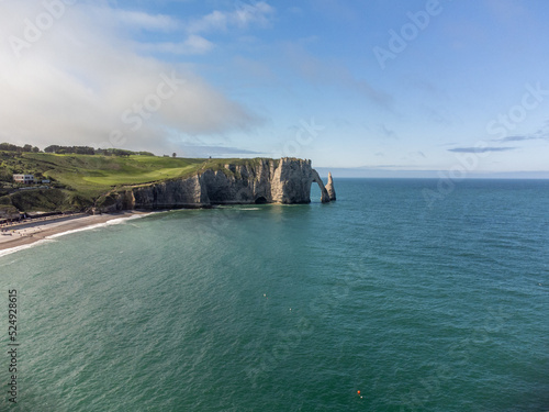 Aerial panoramic view on chalk cliffs and Porte d'Aval arch in Etretat, Normandy, France. Tourists destination.