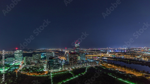 Aerial panoramic view over Vienna city with skyscrapers, historic buildings and a riverside promenade night timelapse in Austria.