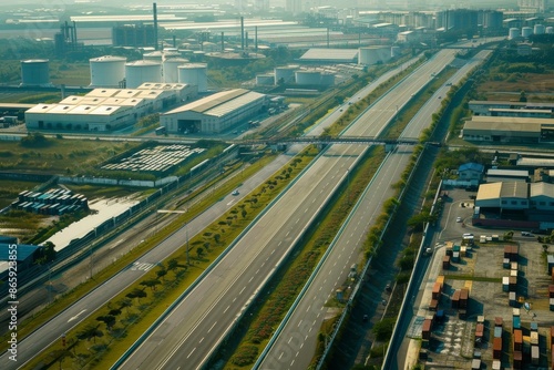 Aerial perspective of a highway passing through industrial district, with factories, warehouses, and shipping containers lining the roadside