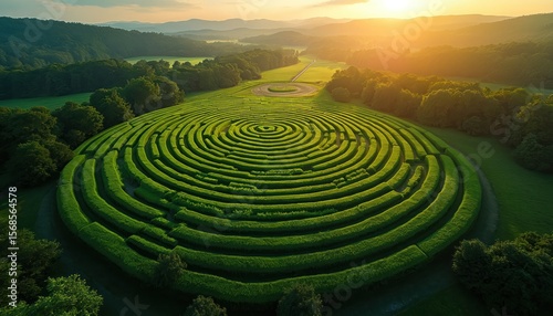Aerial perspective of vast green hedge maze, inviting exploration. Intricate pathways create challenging puzzle design within natural landscape, offering scenic contemplation and discovery.