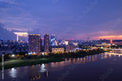 Aerial photography of the night scene of Hexi River Bank in Zhuzhou, China