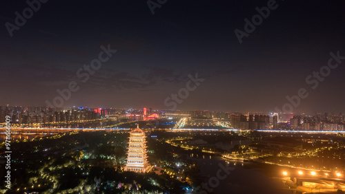 unmanned, architecture, sky, city, outdoors, shine, water, travel, night, dusk, property, automobile, wallpaper, poster, message, night view, xian, lighting, brilliant, scenery, atmosphere, lake
