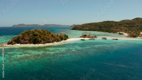 aerial seascape tropical beach with white sand and clear blue sea. tropical landscape with islands and beaches. Philippines, Palawan.