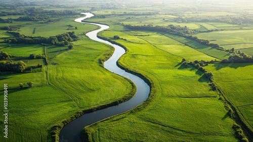 Aerial shot of a curving river winding through a sea of green fields, illustrating the captivating patterns formed by nature