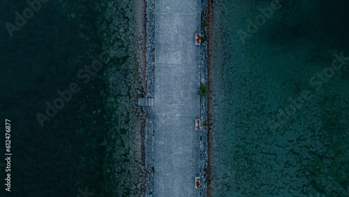 Aerial shot of a walkway viewing point surrounded by dark blue water