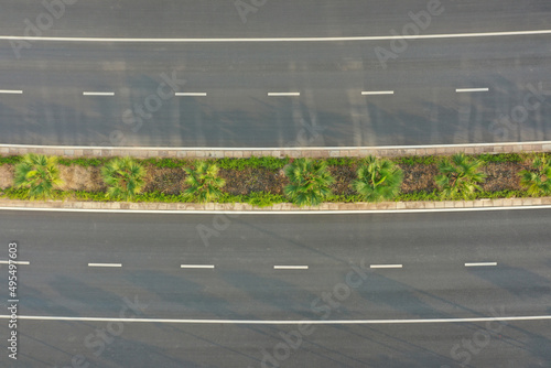 Aerial top view of urban road green belt