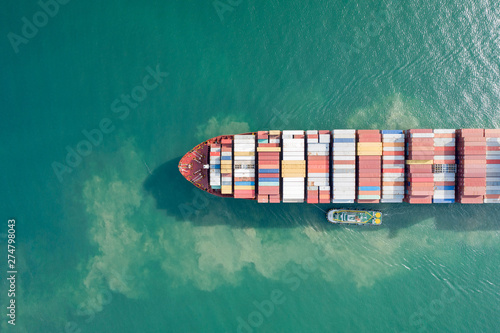 Aerial view and top view. Container ship in pier with crane bridge carries out export and import business in the open sea. Logistics and transportation