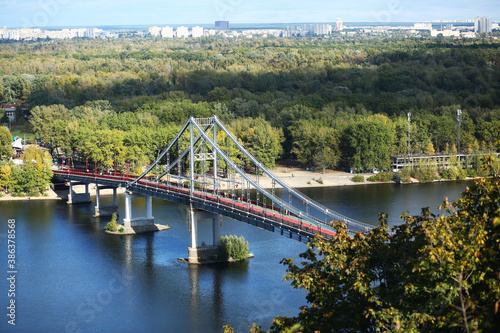 Aerial view at the Dnipro river and downtown Kyiv Pedestrian city bridge