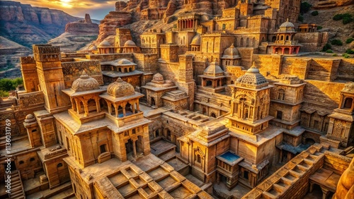Aerial View Carved Stone Architecture, Drone Photography, Sculptural Buildings, Rock Carvings, Ancient City, High-Angle Shot, Architectural Wonders