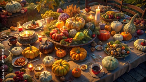 Aerial View Festive Thanksgiving Dinner Table Abundant Colorful Vegetables Harvest Feast