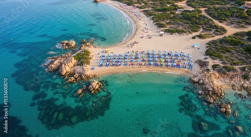 Aerial view of a beautiful sandy beach with rows of blue umbrellas and sunbathers by the turquoise sea, featuring clear water and rocky shores. Perfect scene for a summer vacation or travel theme.
