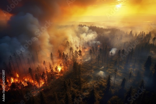 Aerial view of a burning forest. Wildfire, global warming and climate change concept. Generative AI