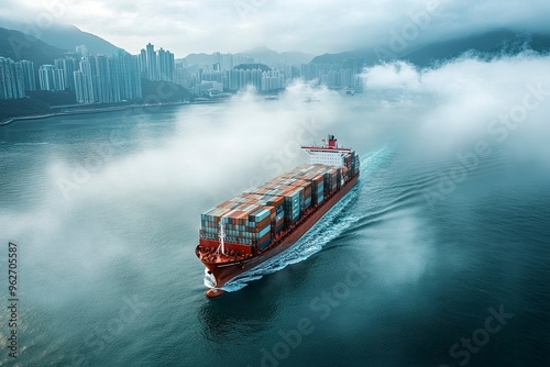 Aerial view of a cargo ship sailing the Hong Kong bay with low clouds, China , ai