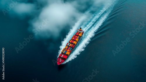 Aerial view of a cargo ship with colorful containers on the sea, top-down view.