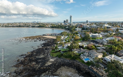 Aerial view of a coastal Takapuna, showcasing modern homes and the waterfront. Residential development meets the ocean. Takapuna, Auckland, New Zealand