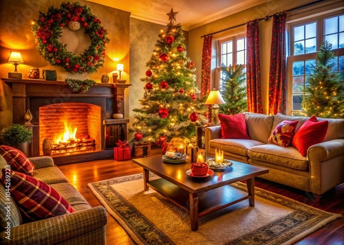 Aerial View of a Cozy Living Room Decorated for Christmas with Festive Lights and Ornaments
