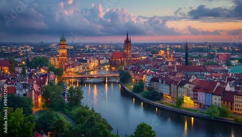city, city landscape, urban, architecture, building, river, water, sunset, twilight, dusk, evening, sky, cloud, bridge, street light, town, historic, travel, tour tourism, europa, poland, danzig, aerial view, drone, photo, beautiful, picturesque, charming, romantic, old, traditional, landmark, skyline
