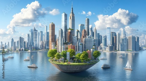 city, skyline, skyscraper, island, water, greenery, nature, architecture, modern, urban, landscape, blue skies, cloud, boat, sailboat, technology, development, environment, harmony, futuristic, serene, adventure, tour tourism, travel, fantasy, concept, innovation, design, vibrant, peaceful, summer, sunlight, scenery, thoroughfare, structural, growth, balance, creativity, image