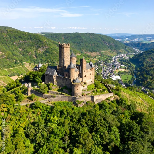 castle, aerial, vale, mediaeval, hill, green, nature, landscape, fortress, stone, mountain, scenic, view, panorama, historic, ancient, european, german, countryside, tour tourism, travel, elevation, fort, vista, peak, surrounding, tower, wall, rugged, tree