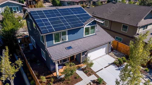 house, solar, panel, roof, energy, home, residential, aerial, view, property, modern, architecture, technology, sustainable, environmentally friendly, environment, clean, power, renewable, blue, grey, driveway, yard, landscape, tree, plant, garden, building, construction, design, estate, structure, development, community, neighbourhood, suburb, dwelling, habitat, sky, window, exterior, new, window, old, wood, real estate, white, residence