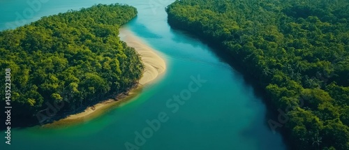Aerial view of a pristine river flowing through a dense, vibrant green rainforest canopy, creating a breathtaking natural landscape