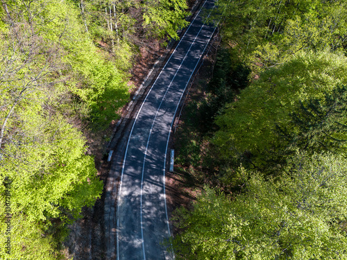 aerial, aerial view, asphalt, background, car, color image, country road, curve, driving, drone, environment, forest, green, highway, horizontal, journey, landscape, mountain, nature, no people, outdoors, photo, pine tree, road, rural, summer, transportation, travel, tree, view, winding, winding road, timberland