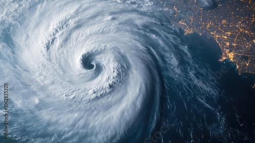 Aerial view of a swirling hurricane, showcasing dramatic cloud patterns.