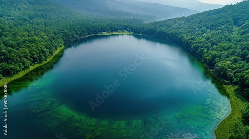 Aerial View of a Tranquil Lake Surrounded by Lush Green Forest