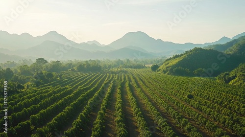Aerial view of a vast orchard at sunrise, misty mountains in the background; agricultural landscape for farming promotion.