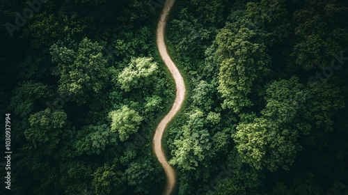 Aerial View of a Winding Forest Path with Lush Greenery and Sunlit Trees