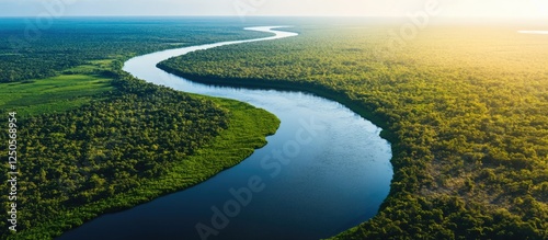 Aerial view of a winding river surrounded by lush greenery flowing into the ocean with ample space for text overlay