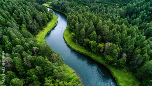 Aerial view of a winding river through a green field and forest, with a meandering stream in the middle.