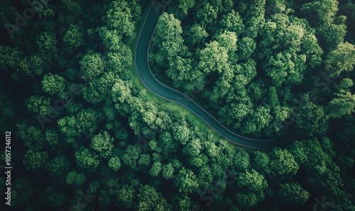 Aerial view of a winding road surrounded by lush green trees, creating a serene and tranquil landscape