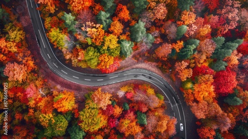 Aerial view of a winding road through a forest, autumn leaves in vivid shades of red, orange, and yellow, cars driving through.