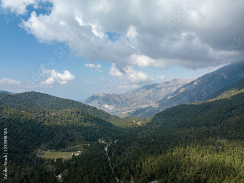 Aerial view of Albanian landscape and mountains along the Albanian Riviera. Beautiful forest location with Albanian Alps in background