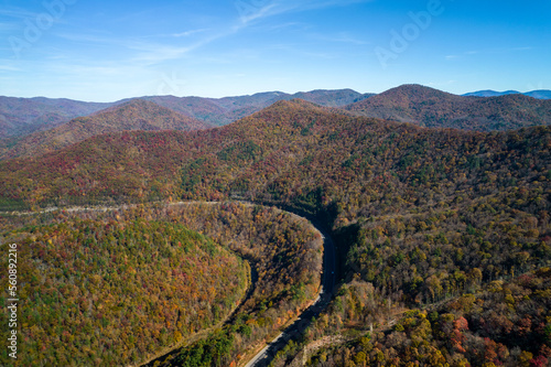 Aerial view of amazing landscape in Virginia. View of mountain river with highway along.