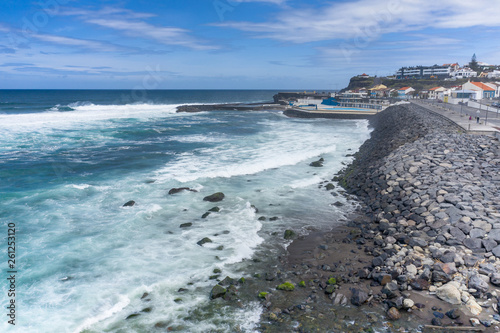 Aerial view of Atlantic coast at Ribeira Grande. Blue water and clouds. Island of Sao Miguel, Azores Islands, Portugal, Europe.