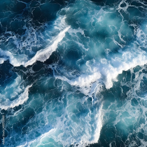 Aerial view of blue and white ocean waves. Generative AI.