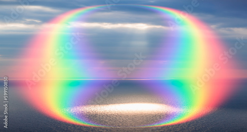 Aerial view of calm sea before storm with amazing strange rainbow at sunset