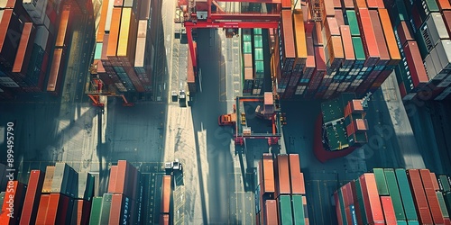 Aerial view of cargo containers stacked at a bustling container port with cranes and shipping dock in the background, showcasing industrial logistics activity with colorful pallets