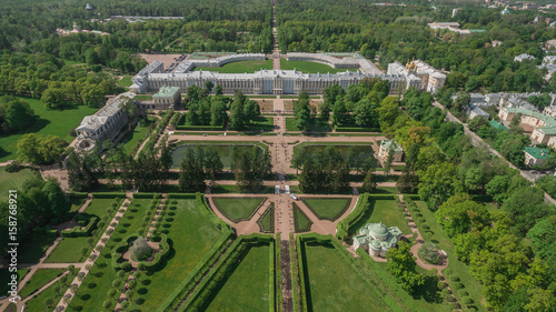 Aerial view of Catherine palace and Catherine park in Pushkin, Russia
