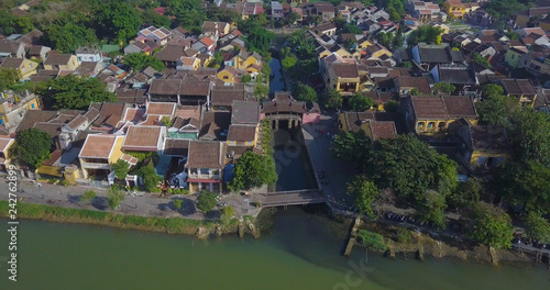 Aerial view of Chua Cau (the Pagoda Bridge) or The Japanese Covered Bridge in Hoi An old town or Hoian ancient town. The Pagoda Bridge is one of the famous tourist and travel in Hoi An, Vietnam